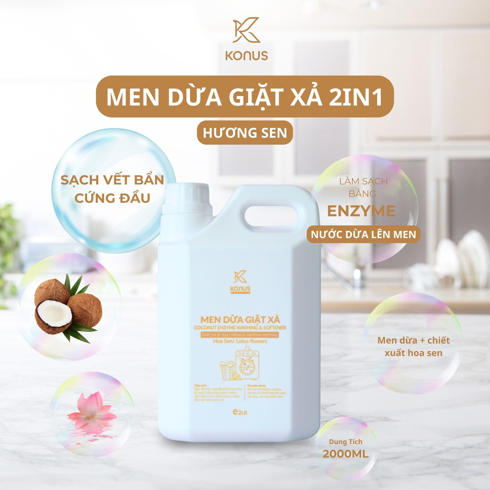 Men Dừa Giặt Xả 2in1 Hoa Sen Konus Homecare Dành Cho Giặt Tay & Máy